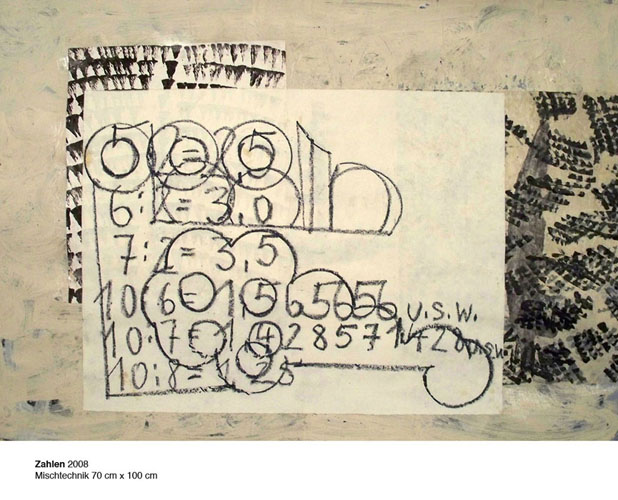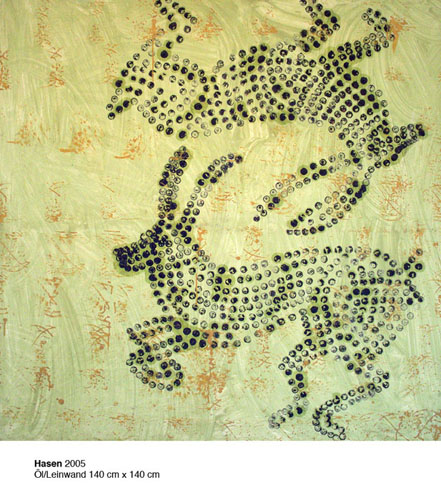 | Hasen 2005 Öl/Leinwand 140 cm x 140 cm |  | Zahlen 2008 Mischtechnik 70 cm x 100 cm |